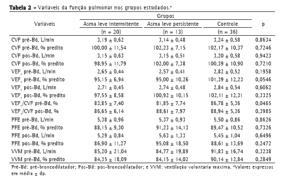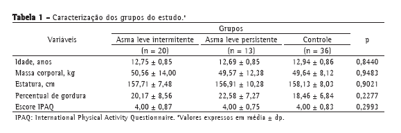 Os três grupos formados (pacientes com asma leve intermitente, pacientes com asma leve persistente e controles) apresentaram características antropométricas e de atividade física semelhantes. Conforme Tabela 1, a ANOVA não encontrou diferenças estatisticamente significativas para as variáveis idade, massa corporal, estatura e percentual de gordura corporal, assim como em relação ao nível de atividade física (escore do IPAQ), através do teste de Kruskal-Wallis, entre os grupos.