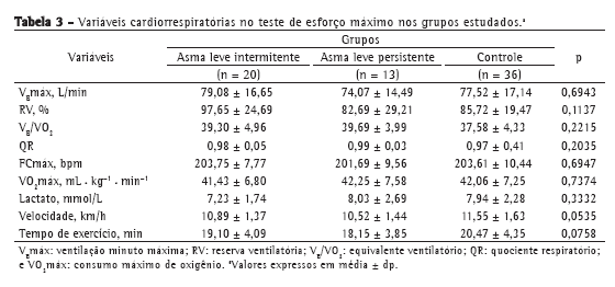 Os valores similares de VO2máx entre os grupos são indícios de que as respostas dos demais sistemas componentes do VO2 não se diferenciam entre si ou que possíveis deficiências são totalmente compensadas. Isso responde a questão relativa à deficiência respiratória, que também é referida nos valores relatados por outros autores.(24-26) Baseado nas variáveis de índice de tolerância ao exercício, tais como VEmáx, VEmáx/VVM, VE/VO2 e VO2máx, pode-se dizer que a gravidade da asma não teve influência sobre a capacidade aeróbica e não se pôde constatar limitações na respiração externa em exercício sobre a mesma (VO2máx) em nenhum dos três grupos estudados.
