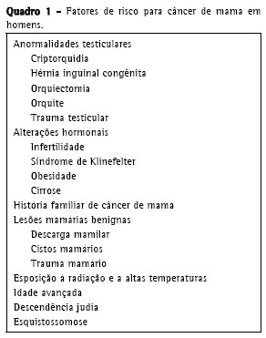Entre 15 e 20% dos pacientes têm história familiar de neoplasia mamária, especialmente entre parentes de primeiro-grau. A presença de ginecomastia ocorre em 6 a 38% dos pacientes, embora não existam evidências que a impliquem como fator predisponente ao desenvolvimento de câncer. Há, ainda, outros possíveis fatores de risco relacionados ao aparecimento da neoplasia (Quadro 2).(1,2,10)