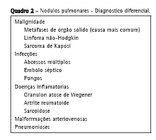 A incidência de metástases para o parênquima pulmonar originadas de neoplasias primárias extratorácicas varia de 20 a 54%. As metástases decorrentes de tumores sólidos são as causas mais freqüentes de múltiplos nódulos pulmonares, responsáveis por cerca de 80% de tais casos (Quadro 1).(4) A tomografia computadorizada de tórax é o exame de escolha para a avaliação de múltiplos nódulos pulmonares. Essas lesões são, na maioria das vezes, menores que 5 mm, e estão localizadas na região subpleural ou escondidas pelas estruturas mediastinais ou pelas cúpulas diafragmáticas.