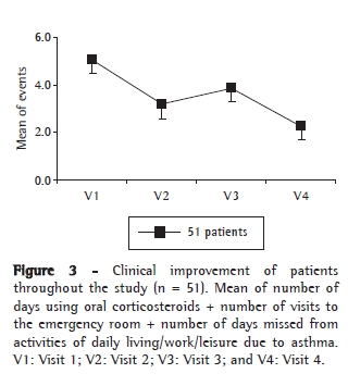 Figure 3 shows the results regarding clinical improvement of the 51 patients. The mean number of adverse events (visits to the emergency room, use of oral corticosteroids and days missed from work or school, or a combination of the two), based on the analysis of the month preceding each visit, decreased significantly between V1 and V2 (5.06 ± 0.44 vs. 3.19 ± 0.34; p < 0.05). This number remained stable between V2 and V3 but showed yet another significant reduction between V3 and V4 (from 3.86 ± 0.39 to 2.27 ± 0.47; p < 0.05).