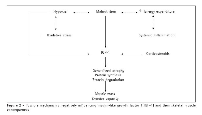 Progressive weight loss is a common finding in this disease and can be identified in up to 50% of patients, especially in those with predominant pulmonary emphysema.(4) Such weight loss is a negative prognostic factor, regardless of the degree of airway obstruction,(5) and has been correlated with increased morbidity and mortality(6) (Figure 1). An energy imbalance, caused by reduced consumption and increased basal energy metabolism, seems to be associated with weight loss.(7) Weight loss is commonly accompanied by a reduction in skeletal muscle mass,(8) probably due to systemic inflammation, which is characterized by high levels of TNF-(9) and IL-6 (potentially involved in the anorexia seen in these patients), hypoxia (contributing to low peripheral oxygen saturation with consequent negative effects on the structure and function of the skeletal muscle), dyspnea (which results in lower food intake) and physical inactivity. Finally, it is notable that malnutrition itself(10) results in protein metabolization as a way of obtaining substrate (Figure 2).(11)