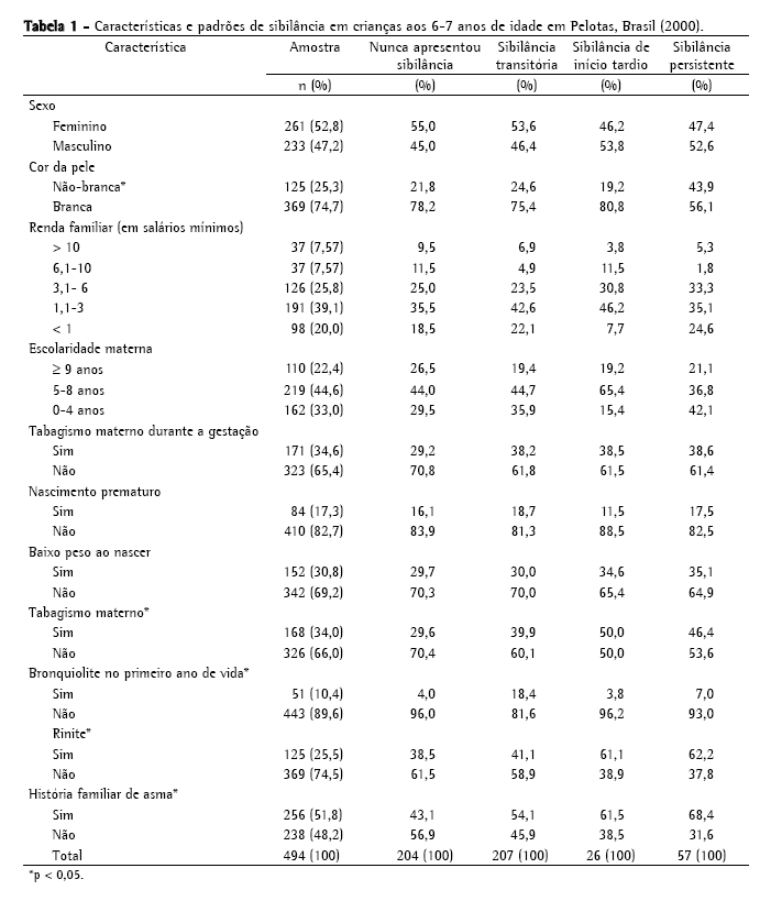 A maioria das crianças era branca (74,7%), do sexo feminino (52,8%) e de famílias de baixa renda (59% das famílias ganhavam ≤ 3 salários mínimos). Mais de 30% das crianças tinham estado em contado com tabagismo antes do nascimento ou em casa durante a infância (tabagismo materno), um quarto tinha história de rinite além de resfriados, e 46% apresentaram testes cutâneos positivos para atopia. As características demográficas, as variáveis sócio-econômicas e os padrões de sibilância são apresentados na Tabela 1.