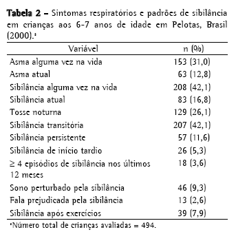Entrevistadores treinados aplicaram questionários às mães das 494 crianças entre junho e setembro de 2000. As perguntas sobre sintomas da asma foram baseadas no questionário do ISAAC.(11) Coletaram-se dados sobre a prevalência cumulativa de sibilância (sibilância alguma vez na vida) e sibilância nos últimos 12 meses (sibilância atual), bem como de tosse noturna, sibilância após exercícios, sono perturbado pela sibilância, fala prejudicada pela sibilância e diagnóstico médico de asma (asma alguma vez na vida e asma atual).