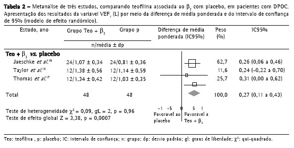O último estudo incluído,(17) que colaborou para a melhora significante do VEF1 nesta metanálise, analisou 12 pacientes com DPOC estável (VEF1 = 1,09 ± 0,35 L), com reversibilidade do VEF1 ao broncodilatador ≤ 15%. A duração do estudo foi de 56 dias, divididos em 4 fases de 14 dias cada uma. As seguintes intervenções foram realizadas: 1) teofilina; 2) salbutamol; 3) teofilina + salbutamol; e 4) placebo. A espirometria foi feita ao final de cada fase. Os grupos tratados com as drogas obtiveram melhora do VEF1 em 13,5% com a teofilina; em 16,2% com o salbutamol; e em 31,3% com as drogas associadas. Portanto, significante melhora com a associação da teofilina e salbutamol.