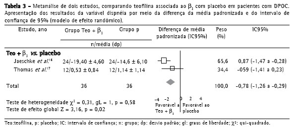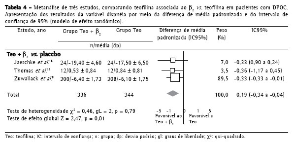 Dispnéia: diferença de média padronizada (modelo de efeito randômico) -0,19; intervalo de confiança 95% (-0,34 a -0,04); p = 0,01; e teste de heterogeneidade p = 0,79. Este resultado é estatisticamente significante e baseia-se em três estudos, com 336 indivíduos no grupo da teofilina associada ao β2-agonista, e 344 no grupo da teofilina isolada(9,16,17) (Tabela 4).