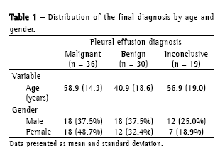 Of the 85 patients evaluated in the present study, 92.9% presented pleural exudate. There was a discrete predominance of malignant pleural effusion (42.4%) over benign pleural effusion (35.3%). These results are similar to those found in the literature, reflecting the frequency of neoplastic pleural effusion, which can account for as much as 50% of the pleural exudates.(21) The distribution found might be related to the fact that this study was carried out at a facility that is a regional referral center for the diagnosis and treatment of thoracic tumors, which might have affected the selection of cases. Twenty-two (76%) of the benign cases were secondary to tuberculosis. This reflects the high prevalence of tuberculosis in Brazil, and the most common presentation of extrapulmonary tuberculosis is the pleural form.(22,23) This high prevalence among the benign pleural exudates was also found in other studies.(20,24,25) In 19 cases (22.3%), it was not possible to differentiate between the benign and malignant cases. Similar results have been described by other authors who reported that, even after cytopathologic study of the pleural fluid and pleural biopsy, approximately 20% of the cases of pleural effusion remain undiagnosed.(26)