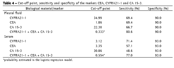 The sensitivity of the three markers in the pleural fluid were similar (CYFRA21-1 = 69.4%, CEA = 69.4%, and CA 15-3 = 66.7%, for a specificity of 90%). When the three markers were used in conjunction in the pleural fluid samples, the sensitivity increased to 80.6%. This finding is in agreement with those of other studies.(5,28-30)