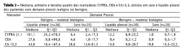 A Tabela 3 mostra os valores da mediana, do primeiro e terceiro quartis dos marcadores tumorais, obtidos no soro e líquido pleural, nos casos malignos e benignos.