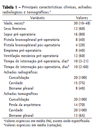 ResultadosDe um total de 103 pacientes portadores de processo infeccioso pleuropulmonar atendidos no serviço de cirurgia torácica, 20 deles foram submetidos à ressecção pulmonar para o tratamento de PN, sendo que 12 (60%) eram do sexo feminino. A média de idade dos pacientes foi de 30 meses (variação: 10-48 meses). Todos os pacientes apresentavam tosse produtiva, febre, sinais de desconforto respiratório e áreas de consolidação pulmonar na radiografia de tórax no momento da internação. Em 15 (75%) desses pacientes, a suspeita de PN foi embasada inicialmente por achados de cavidades na radiografia de tórax. Todos os pacientes foram submetidos à TC axial de tórax, que evidenciava múltiplas cavidades de tamanhos diferentes, indicando necrose do parênquima pulmonar. A média do tempo de internação pré-operatória foi de 10 dias. As principais características clínicas e os principais achados radiográficos e tomográficos estão expostos na Tabela 1.