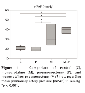 Our study showed that both the monocrotaline model and the model combining monocrotaline and increased blood flow produced by pneumonectomy induce PAH in rats. Analogously and consequently, we observed that RV weight and the index of RV hypertrophy were higher in M+P rats than in M rats, as well as being higher in M and M+P rats than in control and P rats.