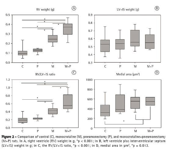 The M and M+P rats showed no differences in medial area when compared with each other. However, when compared with control rats, M and M+P rats showed significantly larger areas (p = 0.013), which confirmed that the two models produce pathological changes typically caused by PAH. Control and P rats showed no significant differences in medial area. One important finding is that there was no intimal proliferation in any of the groups, which is at odds with the findings of other studies.(23,29)