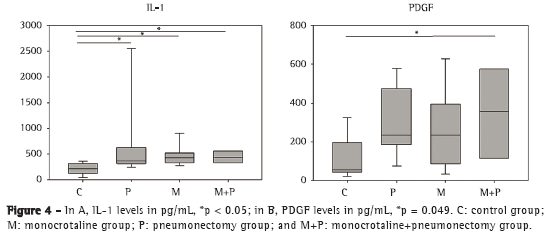 Regarding inflammatory markers, IL-1 levels were significantly higher in P, M+P, and M rats than in control rats, and a similar pattern was found for PDGF levels. This demonstrates that surgical manipulation alone increases the levels of these inflammatory markers, which limits their use in the comparison of the models, although it has been demonstrated that these markers are increased in individuals with PAH.(17,30) However, it is of note that, in our study, the levels of these markers were measured in whole lung samples, and no microdissection technique was used in order to analyze isolated vascular material.(15) This means that any inflammatory phenomenon occurring in the lungs is reflected in the methodology employed, a factor that constitutes a limitation of the methodology.