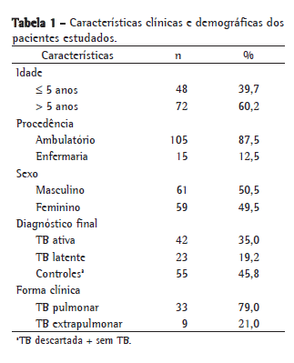 No estudo, foram avaliados 120 pacientes, sendo 93 com suspeita clínica inicial da doença e 27 indivíduos controles. A mediana da idade foi de 7,00 ± 0,42 anos. Não houve diferença significativa em relação ao sexo dos indivíduos. De acordo com o diagnóstico final, os indivíduos foram categorizados da seguinte maneira: TB ativa, TB latente, TB descartada e controle (indivíduos não-infectados; Tabela 1).