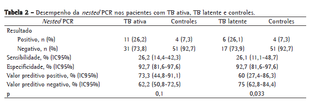 Nesse mesmo grupo de suspeitos, a nPCR foi positiva em 22,58%. A taxa de concordância entre o diagnóstico final dos pacientes e a nPCR foi de 52,38% dos casos com TB ativa e de 28,57% dos casos de TB latente. Em 19,05% dos pacientes cuja TB foi descartada pelo médico, a nPCR foi positiva (Tabela 2).