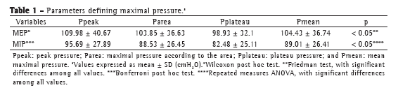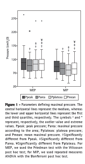 Studies aiming at investigating different parameters defining maximal pressure should take into consideration the various methods for calculating the variables. In the literature, Ppeak has been defined as the maximal pressure sustained for 0.01 s after the initiation of pressure recording(14) and as the highest pressure value obtained during the test.(10,12) Pplateau has been defined as the pressure sustained for 1.0 s(14) and as the pressure sustained for 0.5 s.(12) Pmean has been defined as the mean of the pressure values recorded at peak pressure over a 1-s period.(10) Therefore, there is a clear need for standardizing the use of and the criteria for calculating the various parameters defining maximal pressure. However, further studies are needed in order to investigate whether different criteria for calculating the same variable can significantly influence the pressure values obtained.