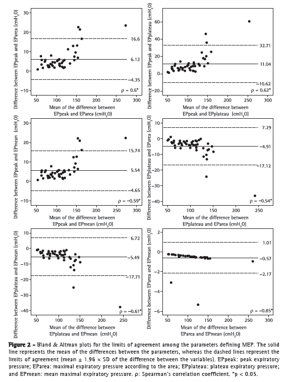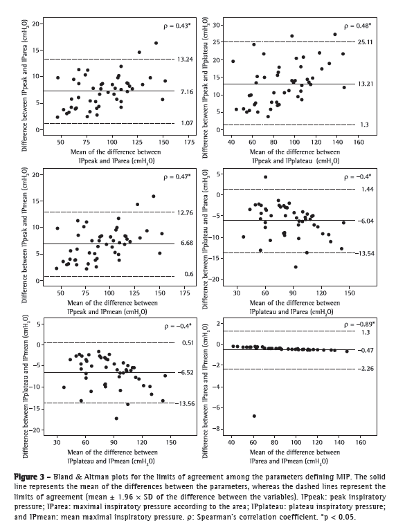 Regarding the agreement among the parameters investigated (Figures 2 and 3), we found that, in general, there was poor agreement between the study variables, especially between Ppeak and the remaining variables. This was expected, given that there were statistically significant differences among the parameters evaluated. However, the narrow limit of agreement between the variables Parea and Pmean for MIP and MEP is of note. Therefore, the question remains as to whether the difference between the parameters Parea and Pmean, although statistically significant, is relevant from a clinical standpoint, given the strong agreement between these two variables.