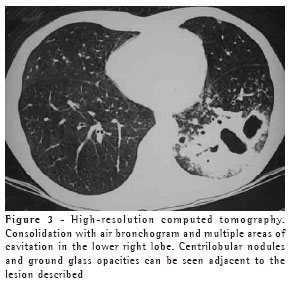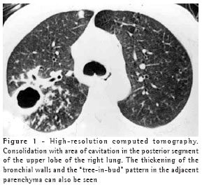 Other findings were ground glass opacities, peribronchial nodules, small nodules of predominantly centrilobular distribution, and the "tree-in-bud" pattern. These alterations were predominantly seen surrounding the cavitated consolidations. In one case, they were also present in both of the lower lobes. It is believed that this finding indicates bronchogenic dissemination of the infection.