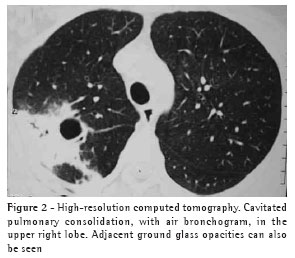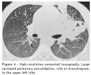 In our study, the principal pattern of pulmonary involvement was air bronchogram and cavitation, which was present in six patients. There were multiple cavitations in five cases and a singular cavitation in one. The consolidations were large and had irregular contours. The air bronchograms were located in the peripheral portions of the lesions. The pulmonary lobe most frequently involved was the upper right lobe, which was affected in four patients. Most of the case review studies confirm these findings.(2,5) Some studies have reported that, although cavitation might not be present at the time of diagnosis, it develops over the course of the disease.(4) In the sample evaluated in the present study, air-fluid levels within the cavitations were seen in only one patient.