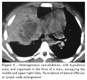 The most frequent finding in the imaging, present in the seven patients, was ill-defined consolidation (Figures 1, 2, 3 and 4). Five of patients presented air bronchogram, principally at the periphery of the lesion. In three cases, the consolidation was organized in the form of a mass. In six of the seven patients, irregular areas of cavitation were observed within the consolidations. Multiple cavitations were seen in five patients, and a singular cavitation was observed in one patient. In the patient presenting no cavitation, there were hypodense areas suggestive of necrosis (Figure 5). Only one of the patients presented air-fluid levels within the cavities.