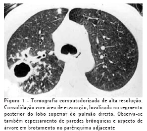 Em um estudo(5) utilizando radiografias e tomografia computadorizada do tórax, foram avaliados nove pacientes, todos com síndrome da imunodeficiência adquirida. A tomografia computadorizada do tórax, utilizando meio de contraste venoso, demonstrou massas com impregnação heterogênea pelo meio de contraste e consolidações pulmonares densas, com ou sem escavações, em oito pacientes. A tomografia confirmou as escavações e níveis líquidos identificados nas radiografias e evidenciou outros três exames em que tais achados não haviam sido suspeitados anteriormente. Linfonodomegalias mediastinais estavam presentes em oito pacientes. Pequenos nódulos centrolobulares e áreas de preenchimento bronquiolar, representando disseminação broncogênica, foram observados em um caso, e múltiplos nódulos com cerca de 5 a 20 mm, a maioria dos quais escavados, observados em dois outros.