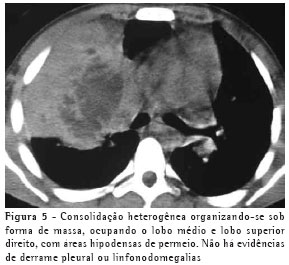 RESULTADOSO achado de imagem mais freqüente, presente nos 7 pacientes, foi consolidação de contornos mal definidos (Figuras 1, 2, 3 e 4), sendo que 5 deles tinham broncograma aéreo de permeio, principalmente na periferia da lesão. Em 3 casos, a consolidação organizava-se sob forma de massa. Em 6 dos 7 pacientes foram observadas, no interior das consolidações, áreas irregulares de escavação, múltiplas em 5 e única em 1 paciente. Em um dos casos não se observou escavação, mas ele mostrava áreas hipodensas de permeio, sugestivas de necrose (Figura 5). Apenas um dos pacientes apresentou nível líquido no interior das cavidades.