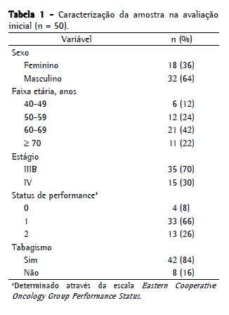 Foram incluídos pacientes adultos, de ambos os sexos, entre maio de 2006 e julho de 2008, com diagnóstico médico de CPNPC nos estágios IIIB e IV e com SP, avaliado pela escala Eastern Cooperative Oncology Group (ECOG) Performance Status, entre zero e dois. Todos os pacientes receberam tratamento clínico com as drogas paclitaxel e derivados da platina, administradas em dose única, a cada três semanas, durante quatro ciclos. Pacientes com idade menor que 70 anos receberam paclitaxel (175 mg/m2) e cisplatina (80 mg/m2), e aqueles com 70 anos ou mais receberam paclitaxel (200 mg/m2) e carboplatina (área sob a curva/5 = 300-600 mg/m2) por ciclo de quimioterapia.
