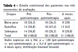 Na avaliação inicial, 10 pacientes (26,3%) foram classificados no grupo baixo peso; 14 (36,8%), no eutrófico; e 14 (36,8%), no sobrepeso. Após a quimioterapia, essa proporção foi, respectivamente, 10, 18 e 10. Para a avaliação do comprometimento do estado nutricional, considerou-se a proporção de pacientes no grupo baixo peso contra os demais. Assim, a proporção de pacientes classificados no grupo baixo peso foi igual nos momentos de avaliação pré e pós-quimioterapia (p = 1,000; distribuição binomial bicaudal).