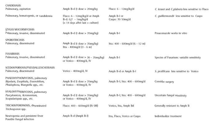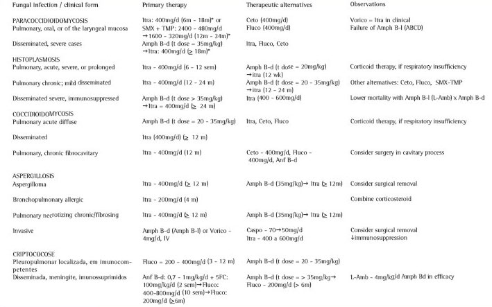 Itra: itraconazole; SMX-TMP: sulfamethoxazole-trimethoprim; (g): treatment sequence; Amph B-d: amphotericin B desoxycholate (conventional); t dose: total dose; Ceto: cetoconazole; Fluco: fluconazole; Vorico: voriconazole; Amph B-l: lipid formulation of amphotericin B (liposomal - L-Amb; in colloidal dispersion - ABCD; or lipid complex - ABLC); Caspo: caspofungin; IV: intravenous; OR: oral