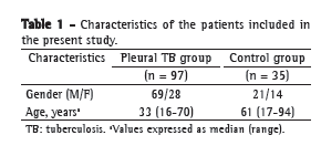 Recent studies have demonstrated that the presence of HspX recombinant antigen-Rv2031c-in serum can be related to latent TB and to active pulmonary TB.(6,7) However, TGF-β, one of the many cytokines induced by Mycobacterium tuberculosis, is increased in patients with pleural TB, as well as being involved in the regulation of the cellular immune response and in the induction of IgA production.(8,9)