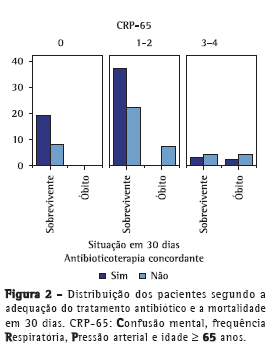 Para avaliar a associação entre a taxa de mortalidade em 30 dias e o tratamento concordante com as diretrizes utilizou-se o CRP-65, devido à ausência da dosagem de ureia sérica em 27 pacientes e à sua semelhança com o CURP-65 como preditor de morte em PAC. Observou-se uma associação inversa significativa apenas para aqueles pacientes classificados com escore do CRP-65 de 1-2 (p = 0,01). Os sete óbitos dessa categoria ocorreram em pacientes tratados com um esquema antibiótico discordante (Figura 2).