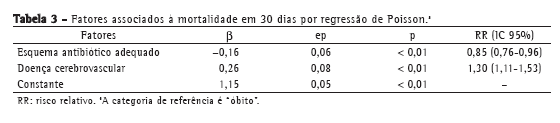 Na presente casuística, as variáveis tratamento antibiótico concordante (risco relativo = 0,85; IC95%: 0,76-0,96; p < 0,01) e presença de doença cerebrovascular (risco relativo = 1,3; IC95%: 1,11-1,53; p < 0,01) associaram-se de forma independente com a mortalidade em 30 dias. Outros autores descreveram a associação entre comorbidades e tratamento antibiótico não concordante com a mortalidade.(7,28)