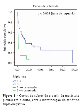 Na análise univariada de Cox, não houve associações significativas da mortalidade com a identificação de células malignas no líquido pleural, com o tipo histológico do tumor primário, com a idade ao diagnóstico do tumor primário ou com a expressão de Ki-67. Entretanto, a análise univariada de Cox e as curvas de Kaplan-Meier revelaram uma associação estatisticamente significativa entre câncer de mama triplo-negativo e mortalidade (Tabela 2 e Figura 1, respectivamente), sendo que as curvas apresentaram uma associação forte no teste de log-rank (p < 0,001), com um hazard ratio de 3,12.