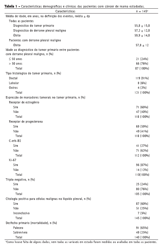 Foram identificadas e avaliadas 145 mulheres com câncer de mama encaminhadas ao nosso hospital para a investigação de derrame pleural maligno. A Tabela 1 mostra as principais características demográficas e clínicas da amostra estudada.