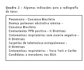 Mais curioso ainda é observar que as II Diretrizes atuais preconizam a radiografia do tórax para os suspeitos de tuberculose extrapulmonar e não para a pulmonar, e que nossa Sociedade preconiza radiografia para os suspeitos de pneumonia (800.000 internações anuais pelo Sistema Único de Saúde) e para os portadores de doença pulmonar obstrutiva crônica (10% a 15% da população maior de 40 anos).