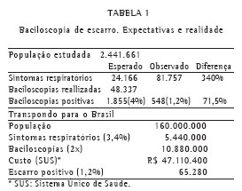 Retornando aos dados da Tabela 1, verifica-se que extrapolações para o país permitem concluir que deveriam ser realizadas cerca de 11 milhões de baciloscopias, com o custo calculado pela tabela do Sistema Único de Saúde de cerca de 50 milhões de reais, quantia não desprezível para qualquer programa de saúde em qualquer país. Acrescente-se ainda que os gastos com radiologia correspondem a menos de 2% nas unidades que tratam de tuberculose.(21)