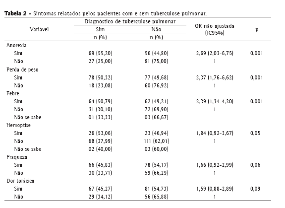 Certos sintomas, tais como anorexia (OR = 3,69; IC95%: 2,03-6,75), perda de peso (OR = 3,37; IC95%: 1,76-6,62) e febre (OR = 2,39; IC95%: 1,34-4,30), apresentaram associação significativa com tuberculose pulmonar. Entretanto, sintomas clássicos como hemoptise (OR = 1,84; IC95%: 0,92-3,67), fraqueza (OR = 1,66; IC95%: 0,92-2,99), sudorese noturna (OR = 1,24; IC95%: 0,71-2,17) e dor torácica (OR = 1,59; IC95%: 0,88-2,89) não o fizeram (Tabela 2).
