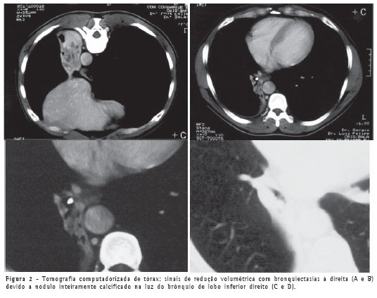 A tomografia computadorizada de tórax confirmou a atelectasia e mostrou pequena lesão calcificada em luz de brônquio no lobo inferior direito (Figura 2), além de bronquiectasias com provável impactação mucóide no lobo pulmonar colapsado.