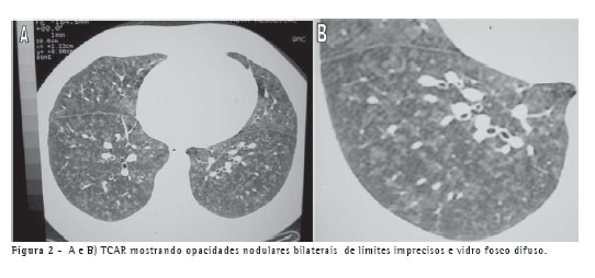 Foram realizadas espirometria, ultra-sonografia de abdome com doppler e biópsia retal com pesquisa de esquistossomose, cujos resultados apresentaram-se normais. A radiografia de tórax inicial foi considerada normal (Figura 1A). Contudo, na tomografia computadorizada de alta resolução foi notado um padrão de vidro fosco difuso com pequenas opacidades nodulares bilaterais, de limites pouco definidos (Figura 2).