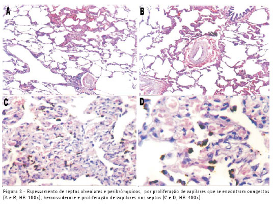Na biópsia pulmonar post-mortem, encontrou-se intensa proliferação multifocal de capilares nas paredes alveolares, septos interlobulares, em região peribrônquica e perivascular, assim como na pleura.