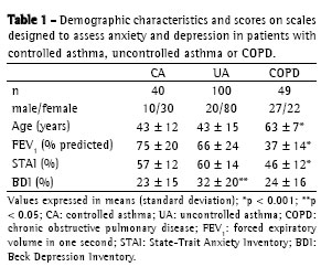 The principal limitations of this study are related to the methodology. First of all, this study was outlined based on a selection of data from different patients evaluated at random, with distinct objectives. Included in the groups were patients with different degrees of asthma severity, which might have influenced (positively or negatively) the results. Second, the patients were not submitted to a psychiatric evaluation after the determination of the STAI and BDI values. Therefore, it was not possible to tell which individuals were actually psychiatric patients.