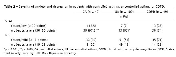 As can be seen in Table 2, the analysis stratified by severity did not show a significant difference in relation to the levels of depression. However, regarding anxiety, the prevalence of moderate and severe anxiety was significantly higher among the patients with uncontrolled asthma and the patients with controlled asthma than among those with COPD (p < 0.05 and p < 0.001, respectively).