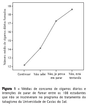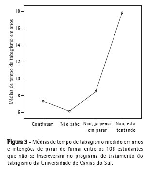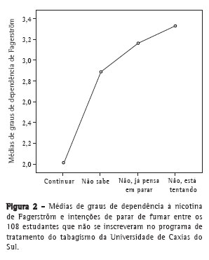 Foram entrevistados 122 alunos, dos quais 108 não se inscreveram no programa de combate ao tabagismo e 14 o fizeram. Dos 108 que não haviam se inscrito no programa, 102 (94,44%; intervalo de confiança - IC: 88,29% a 97,93%) não mostravam intenções de parar de fumar. A distribuição verificada foi: 62 queriam continuar fumando (57%), 40 estavam indecisos ou já pensavam em parar (37%) e 6 estavam tentando (5,6%). A intenção de fumar, a quantidade média de cigarros fumados diariamente, os graus de dependência à nicotina de Fagerström e o tempo de tabagismo mostraram-se com padrão ascendente de linearidade, conforme mostram as Figuras 1, 2 e 3.