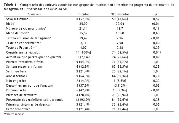 As comparações entre os grupos de inscritos e não inscritos mostraram diferenças estatísticas, respectivamente, nas idades 35 e 23 anos, p < 0,01, e no tempo de tabagismo em anos, 19,42 e 7,36, p < 0,01. Consideraram-se viciados 100% e 58,5%, p = 0,047, acreditavam que podiam parar de fumar quando quizessem 7,1% e 22,6%, p = 0,02, desconheciam os motivos que os faziam fumar 37,5% e 12,00%, p = 0,03, e sofriam discriminações 42,9% e 9,3%, p < 0,01, respectivamente (Tabela 1).