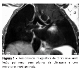 Relato de casoPaciente de 26 anos, sexo feminino, internada para a investigação de massa tumoral em lobo superior esquerdo, com invasão mediastinal e de parede torácica. Queixava-se de dor torácica há 60 dias, sem irradiação, que não melhorava ao uso de analgésicos, acompanhada de febre diária, dispneia, queda do estado geral e tosse produtiva com expectoração mucoide. Negava perda ponderal, hemoptise, cefaleia e outros sintomas neurológicos.
