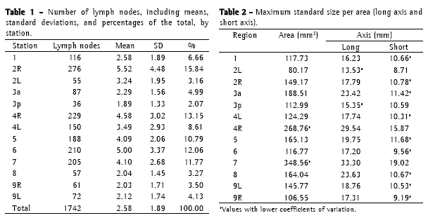 The size of the lymph nodes was not uniform among the stations. Therefore, the short axis means for station 7 were significantly higher than the others. Station 4R presented the second greatest mean, which coincides with the observation made by other authors, who reported a significant difference in the dimension of the lymph nodes located in the upper mediastinum when compared to that of the nodes adjacent to the carina.(20)