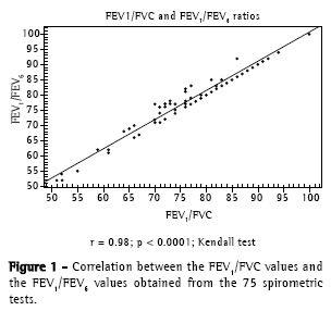 The data were analyzed using the Epi Info 2002 statistical program, and the statistical correlation between the two variables studied (FEV1/FVC and FEV1/FEV6) was calculated using the Kendall test and the t-test for paired samples, using the Analyse-It software. The sensitivity and specificity were calculated in a 2 × 2 table using the Bayesian model analysis.