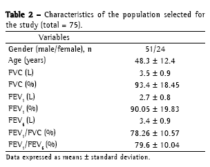 The data regarding the total number of spirometric tests performed, as well as that of those excluded from and selected for the study, are shown in Table 1.Data regarding the population selected for the study (n = 75) are shown in Table 2.