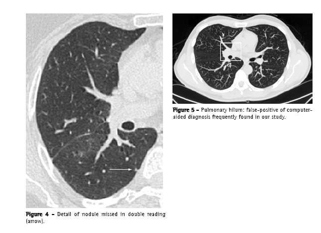 Another noteworthy finding is that the nodules indicated by the computer program were presented in apparently random order, without correlation with the sequence of slices, which slowed the process. In addition, the CAD often showed the same structure more than once in the same slice, or in subsequent slices, whether it was a true-positive or false-positive result. The numbers regarding sensitivity and insignificant impact on the reading by radiologists are not in accordance with those of other recent MDCT studies.(18,23-25) The discrepancies in the results obtained leave this and other recent studies open to some criticism.