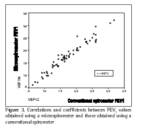 It is important to mention that no measurement or calculation is valid if the equipment used is not carefully calibrated. The devices used in the present study were inspected by reliable technicians prior to initiation of the measurements. The conventional spirometer was calibrated using a three-liter syringe, and the microspirometer was also tested prior to the verifications using expiratory maneuvers performed by a researcher.